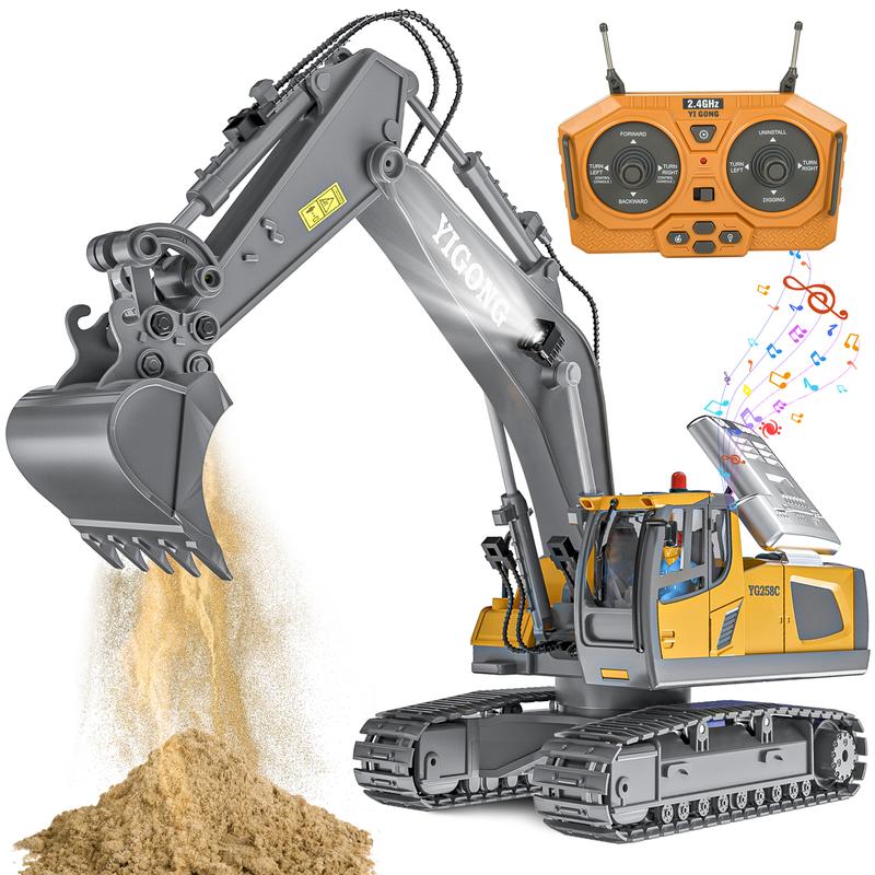 [Looks very realistic] Excavator digging shovel is made of metal,very strong and durable,safe and non-toxic,the rubber dual track tires have excellent grip and are not afraid of sand, sand, cement Various terrains, suitable for children to play outdoors.,and it also has realistic excavator lights and sounds.[Easy to use] 11-channel RC Excavator toy features move forward/backward,left/right turn,up and down lifting to excavate and move loose sand,performs in-situ 360°and cab 680°rotation (340-degree each direction).[2.4Ghz Superior Control Experience] 2.4 GHz frequency will not confuse with other remote control toys.Kids can play multiple rc vehicles together with superior experience.Excellent for role playing games and for sandpits,like dump truck,cement mixer truck,bulldozer and other construction toy.[The best gift choice] Cool Gifts Ideas for Kids excavator comes in a exquisite package box which is great Birthday&Christmas gift. Excavator truck, 2.4Ghz transmitter, 1200Mah rechargeable battery for the truck, USB charging cable, The transmitter requires a AA batteries (included).Just get ready to have fun with it!