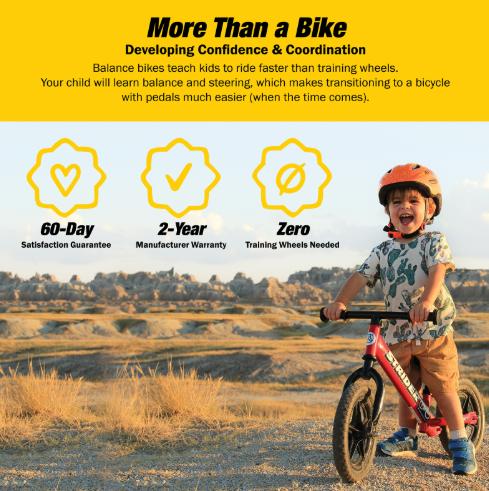 Balance bikes are proven to teach kids to learn to ride faster than training wheels.The seat and handlebar heights adjust to accommodate ages 18 months to 3 years. The 11-inch seat height allows your toddler to easily straddle the bike at a young age.Never flat, no-maintenance, 12" foam rubber tires will ensure safe and steady riding over any terrain.The All-Weather Plastic Mini-Seat stays intact through rain, sleet, and shine.With a toddler size seat, the 12" Classic has a seat range from 11-16 in. (28-40 cm) to fit the tiniest of toddlers with an inseam of 12-17 in. (30-43 cm).The 12" Classic has a lightweight steel frame that weighs in at 6.5 lbs. (2.9 kg).Easy, no stress assembly with all tools included.